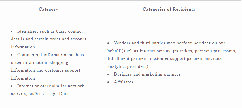 - Our payment processors, who collect payment information (e.g., bank account, credit or debit card information, billing address) to process your payment in order to fulfill your orders and provide you with products or services you have requested, in order to perform our contract with you.